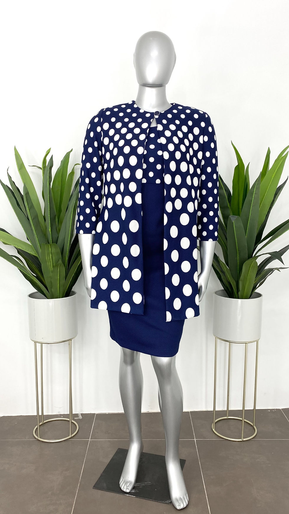 VESTIDO MIDI CON BLAZER DISEÑO DE CIRCULOS BLANCO Y AZUL